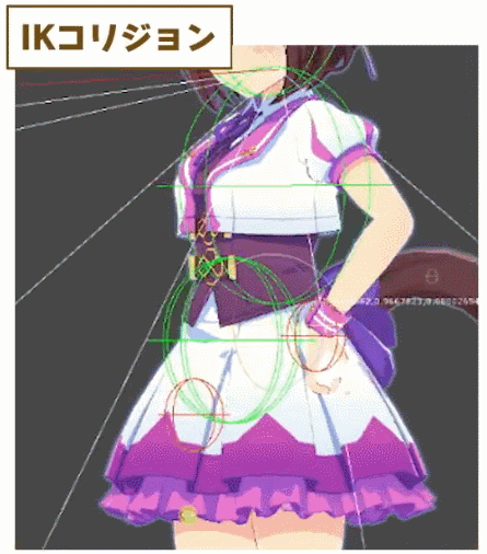 下图里,角色手部模型与衣服重叠,在使用了IK Collision以后,手部与衣服紧贴,并不再穿模。与此类似,通过这个手法,即便动作各不相同,但都能在维持赛马娘魅力的同时,节省调整的工序。