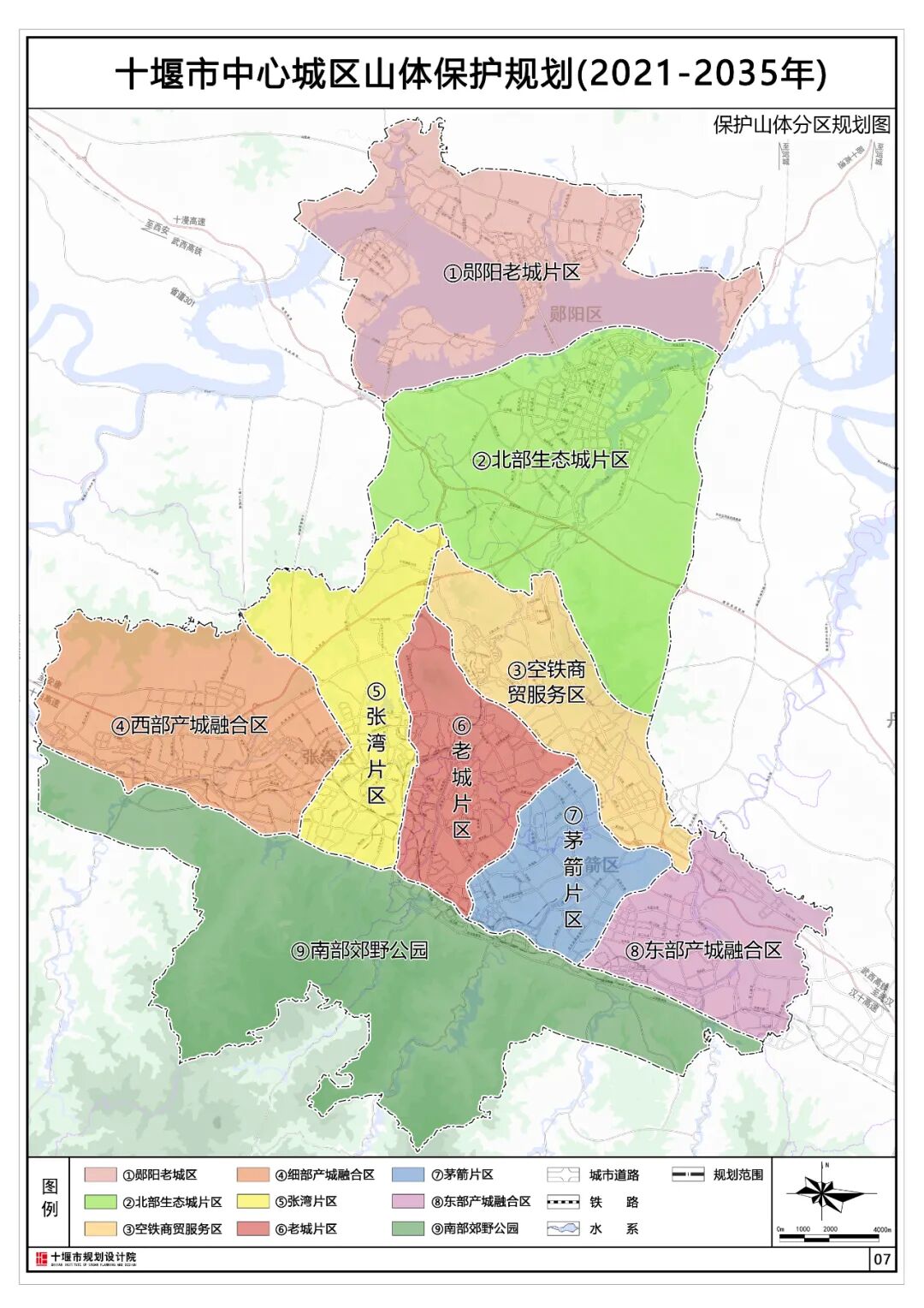 规划将中心城区保护山体划分为九个区域,分别是郧阳老城片区、北部生态城片区、空铁商贸服务区、西部产城融合区、张湾片区、老城片区、茅箭片区、东部产城融合区、南部郊野公园。