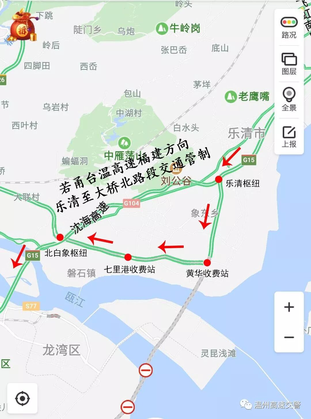 尽量避开G15沈海高速乐清至大桥北路段,车辆可以绕行G1523甬莞高速——S10温州绕城高速。