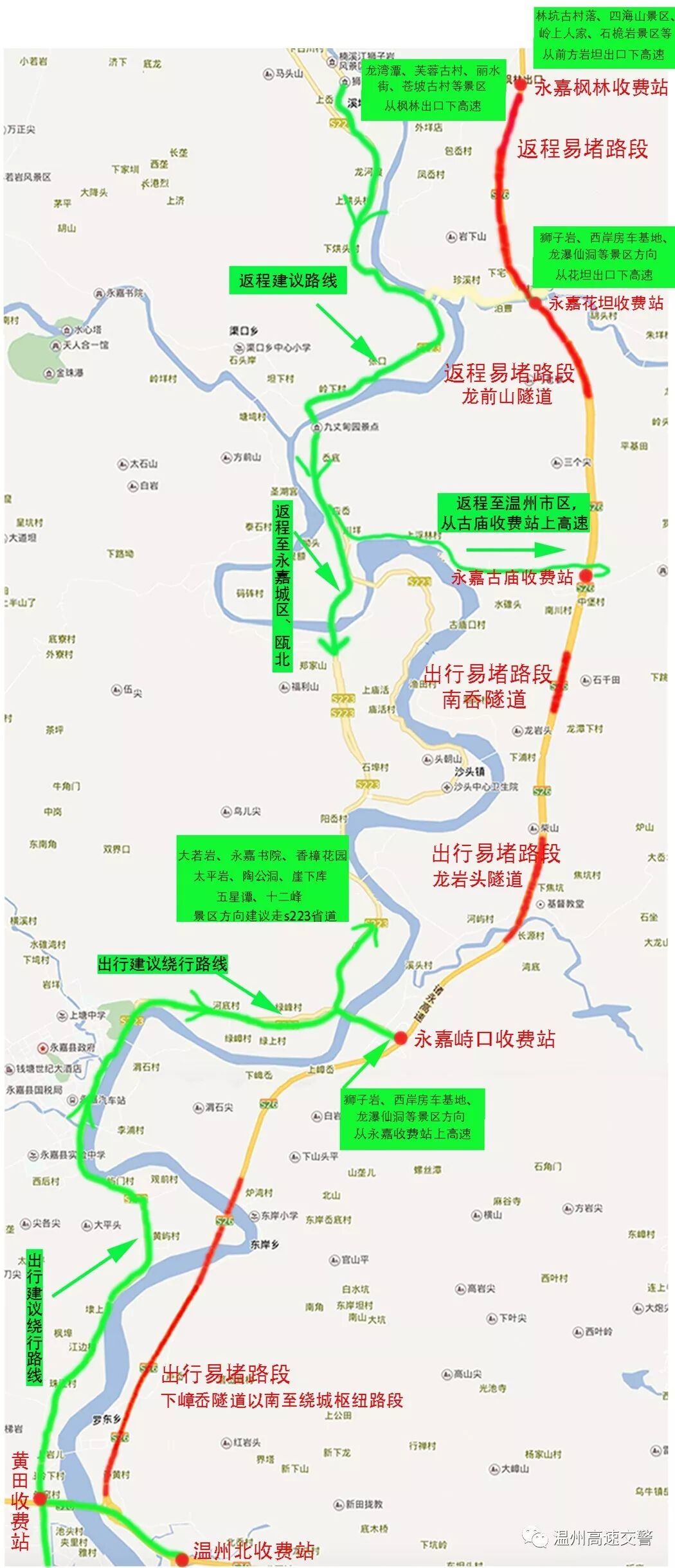 返程高峰期间,永嘉游客可从岩坦、枫林收费站下高速,再沿S223省道返程,市区游客可从岩坦、枫林收费站下高速,再沿S223省道至黄田、永嘉、古庙收费站上高速,再从温州北下高速。