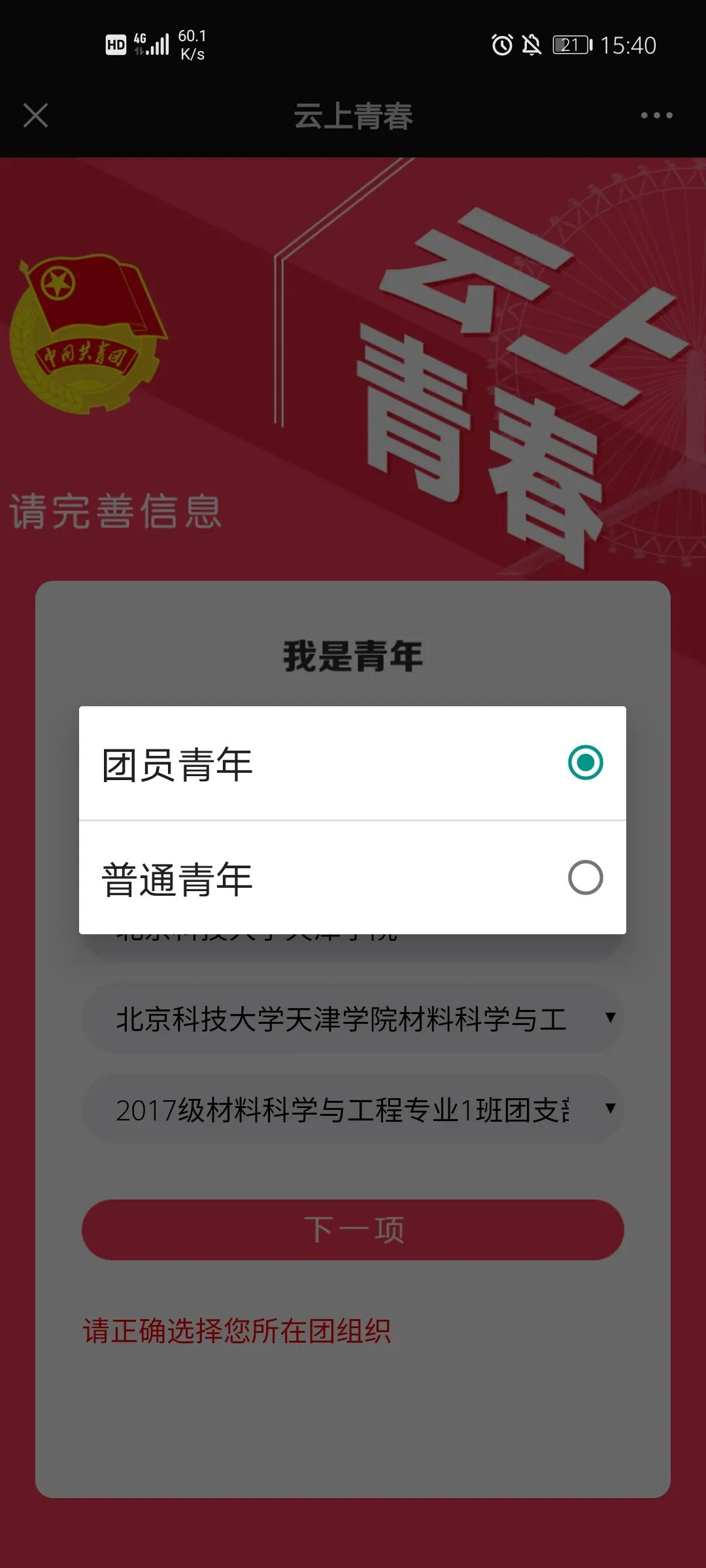 选择团员青年/普通青年