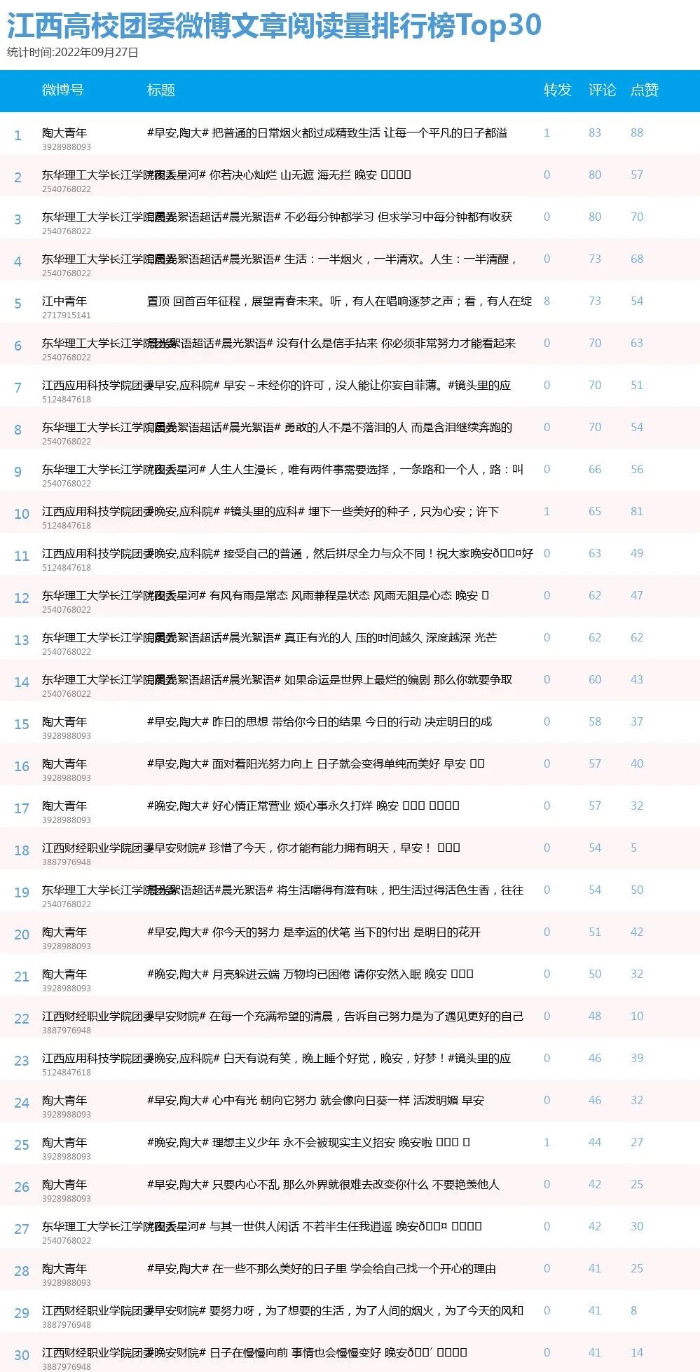 据榜单显示,青春师大、陶大青年、江中青年、江西应用科技学院团委、东华理工大学长江学院团委、江西理工大学团委、江西财经职业学院团委、东华理工青年、江西科技师范大学团委、江科青年进入榜单前十名。
