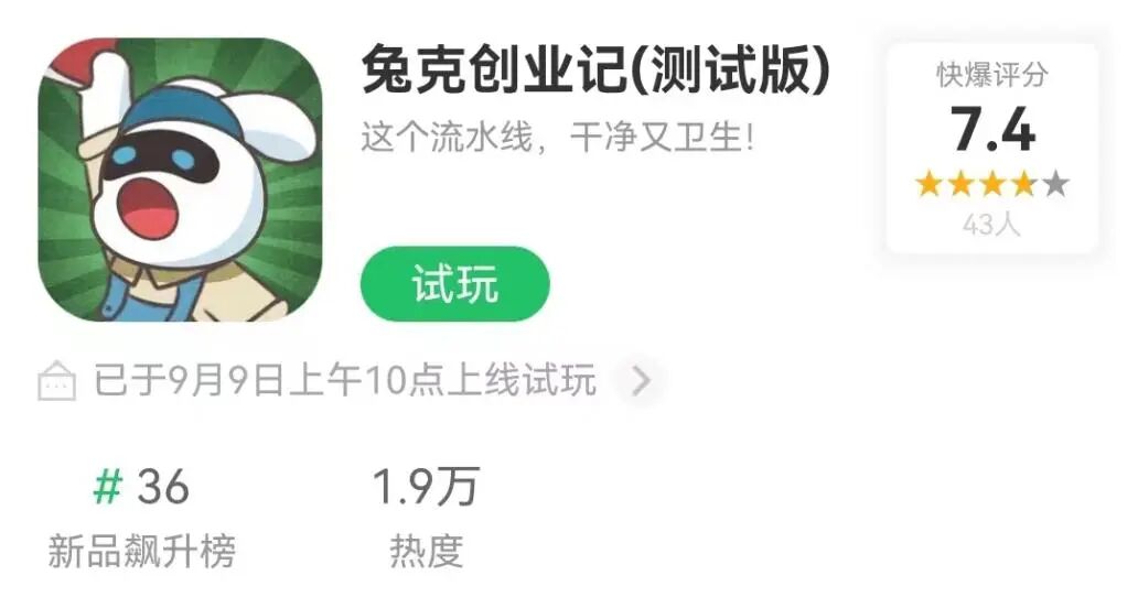 其中,《兔克创业记》是一款以80年代为背景的怀旧风格的模拟经营游戏,该游戏以流水经营玩法为主线,玩家需要带领下岗的“兔克们”,搭建一个生产烤鸭、冰糖葫芦、红白机等各种物品的流水线,推动工厂健康经营。该游戏以其可爱的画风和轻松的经营玩法吸引了多个平台玩家的喜爱,当前该游戏在TapTap和好游快爆等平台均已上线试玩,且当前已在两个平台分别收获了7.0和7.4的玩家评价。