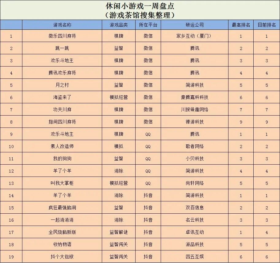 休闲新游周报每周统计微信小游戏、QQ小游戏、抖音小游戏、硬核小游戏以及App Store和Google Play上的新游爆款,并按照分类制作表格,将游戏排名情况等信息公布,希望给到行业同侪帮助。