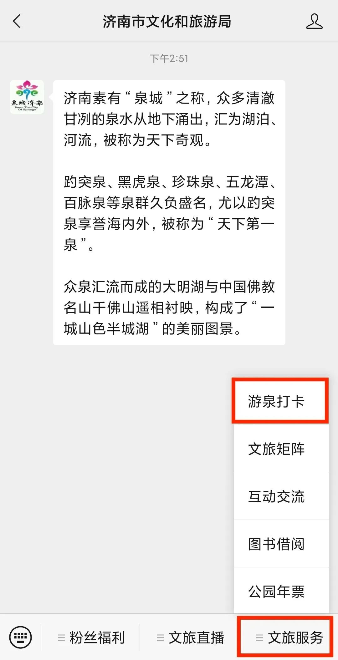 Step1:微信扫码登录“游泉打卡”小程序,或在济南市文化和旅游局微信公众号菜单“文旅服务”中,点击“游泉打卡”,按照小程序提示参与活动。