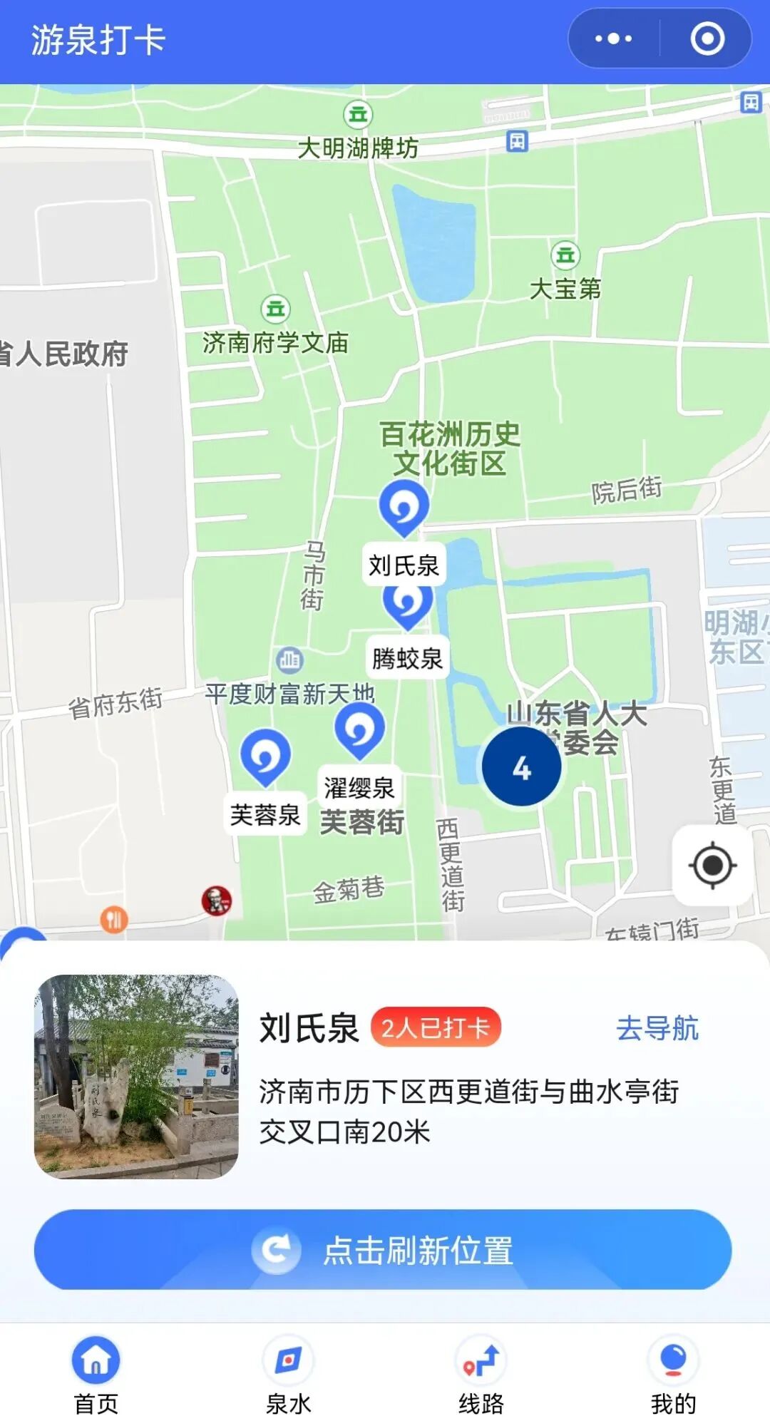 Step3:根据小程序地图显示寻找打卡位置,在地图标注点或泉水附近,点击刷新位置,均可打卡。