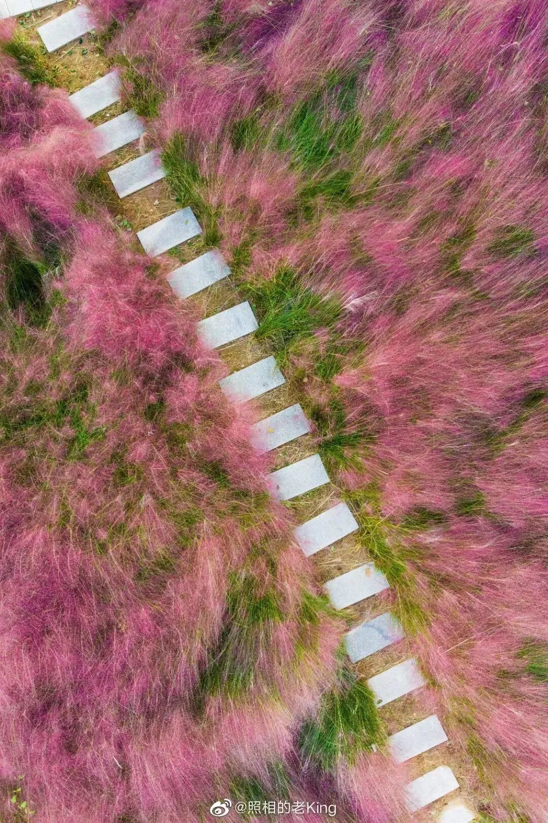 花海之间还设置了人行步道,顺着小径穿梭,像走在粉黛做成的迷宫里。