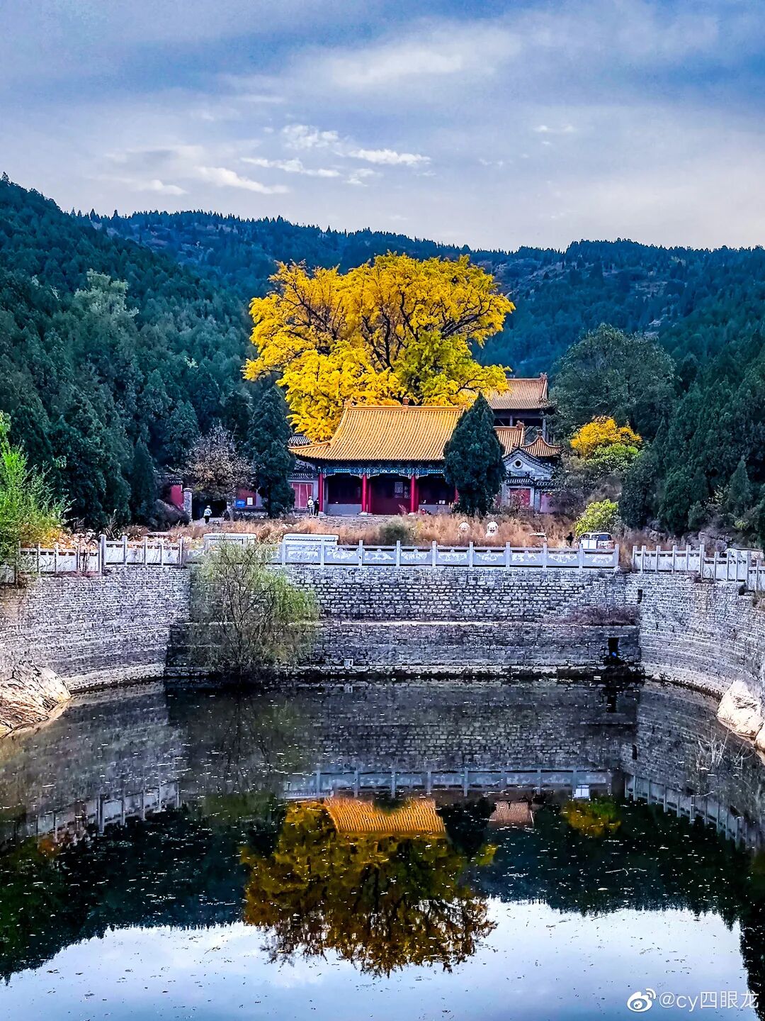 黄色的寺顶和那棵高大的古银杏树在深秋中如金镶玉般美轮美奂,甚是壮观!