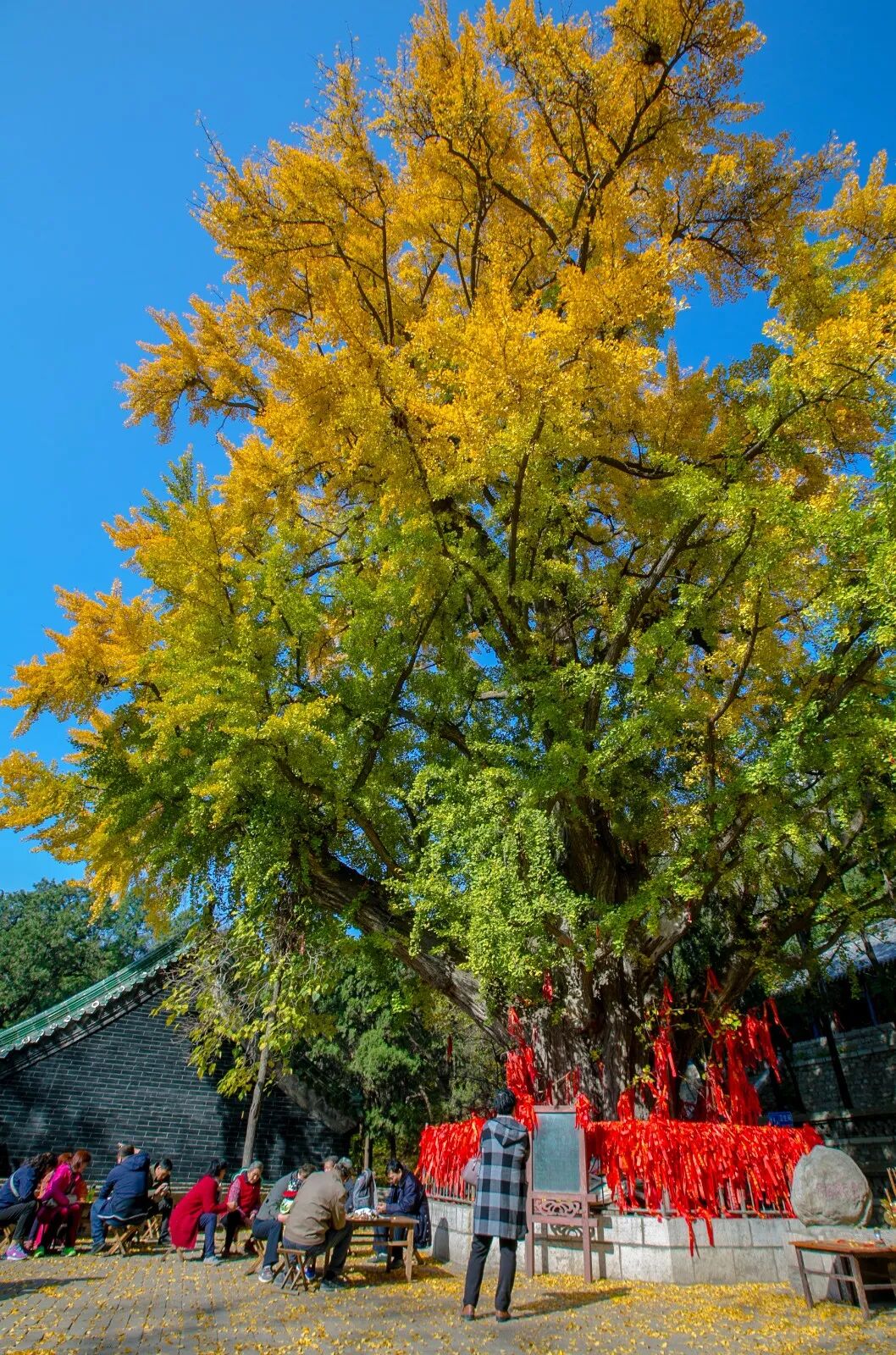 据传这两株老银杏已经有一千五百年了,一雌一雄相携走过漫长岁月,每到秋天,满树挂金,黄叶铺地,美不胜收。
