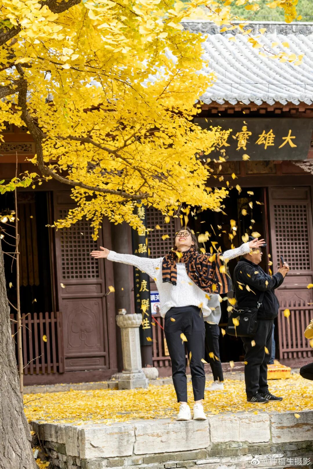 听着禅音袅袅,深秋与禅意相融那一刻,忍不住弯腰拾起一片银杏叶,随手一挥,随风寄送一片祝福,也让镜头留住这美好的时刻。