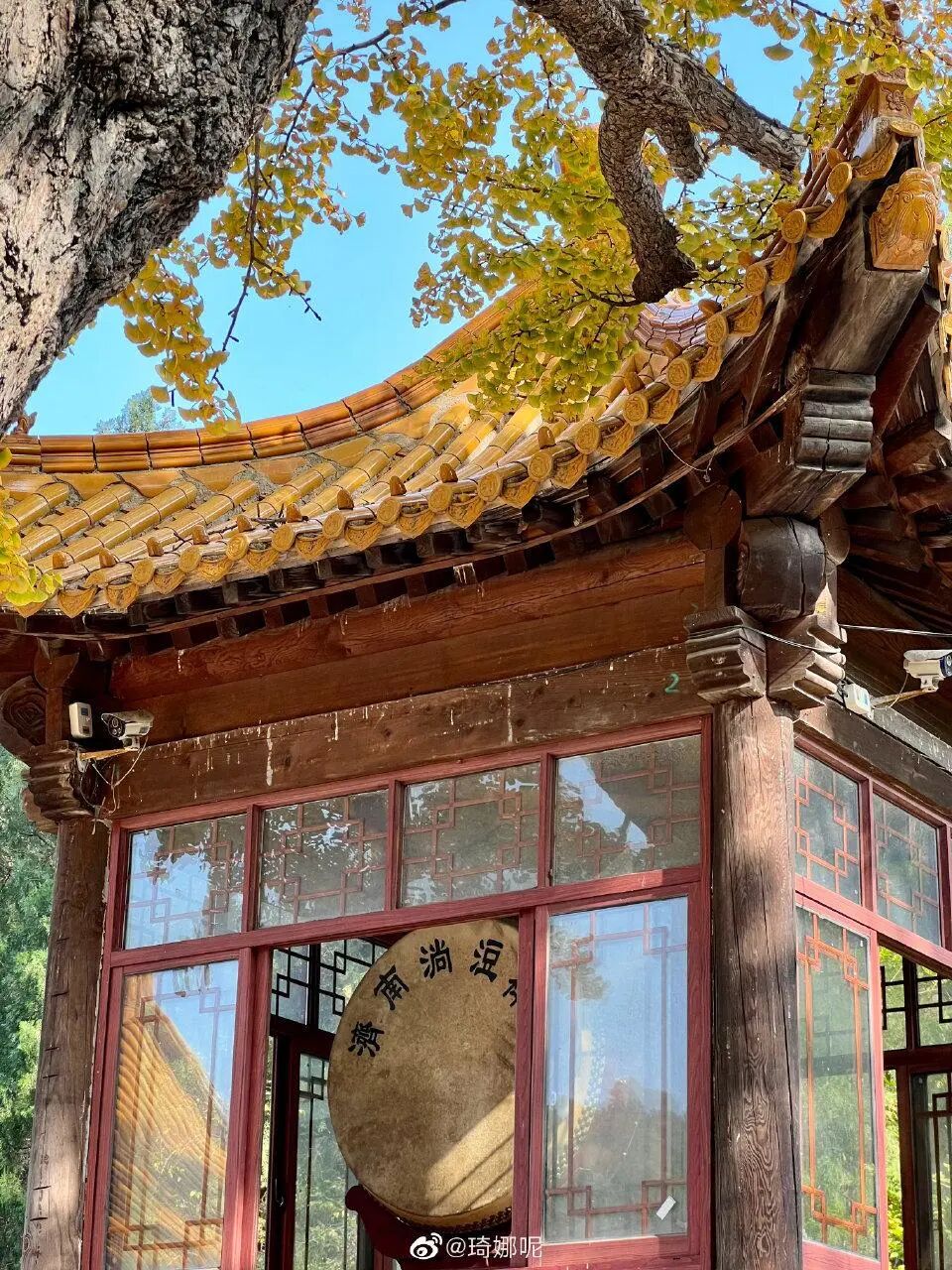 银杏树依寺庙而立,向上看去,树上缀满白果。寺庙借助银杏树的旖旎风光,占尽春光秋色。