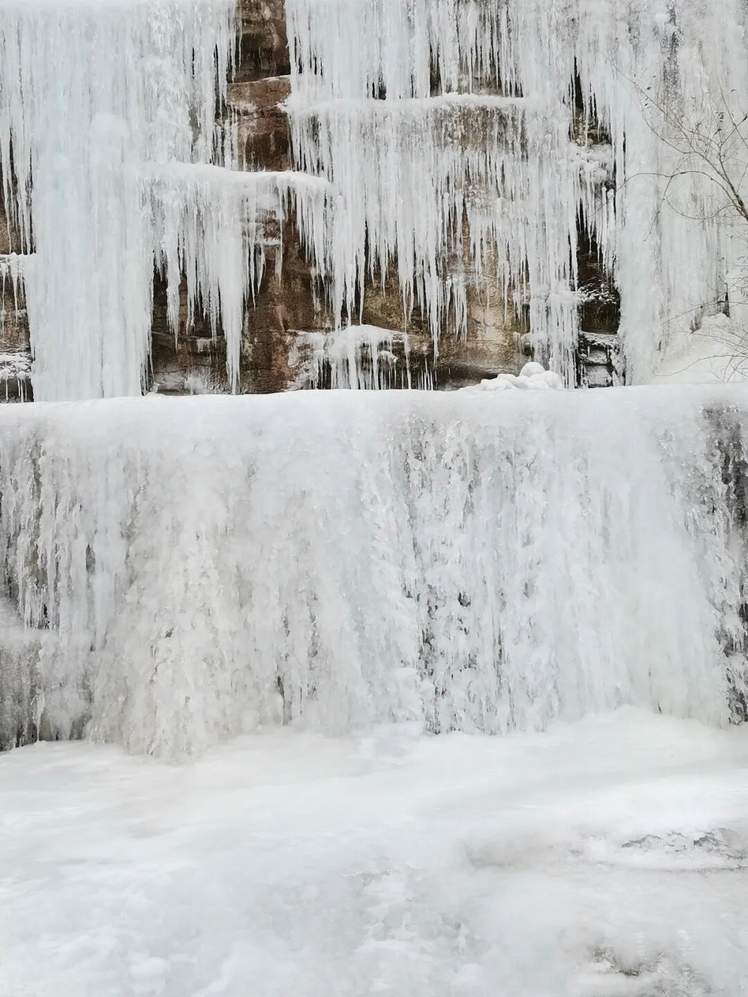 往日流水潺潺的瀑布,仿佛被施了魔法,定格在山坳之中,悬挂在岩石上,不仅凝结成一道白练,更有巨大的冰瀑悬挂,形成红叶谷冬季独特的景象。