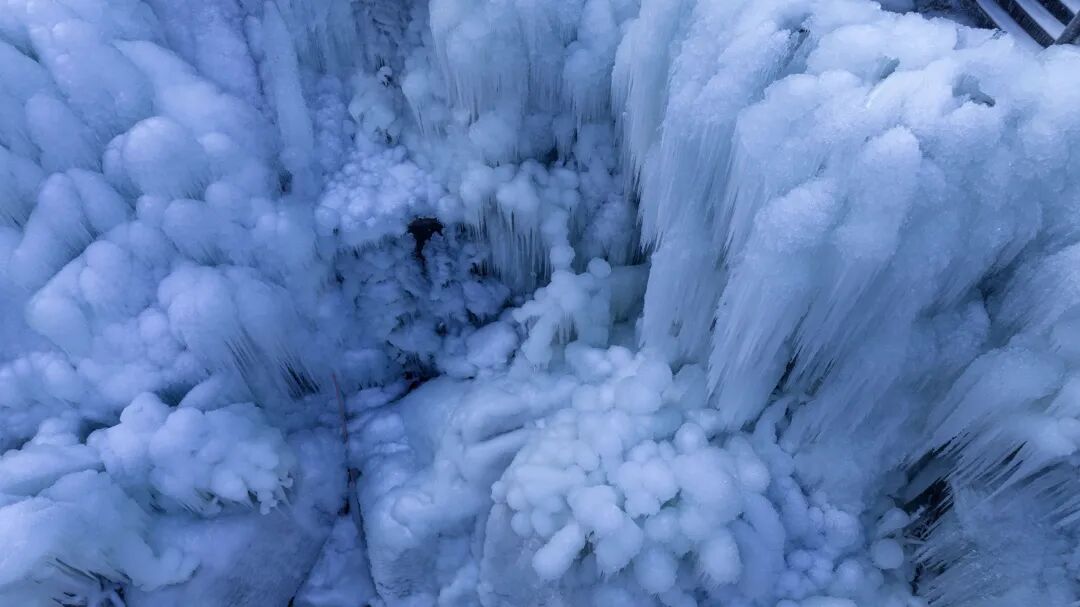 冰瀑将整个山体覆盖,它们形态各异,从远处看,像定格的巨浪、又像是浑然天成的冰雕,站近了看,它们在山脚堆积凝聚,像一朵朵蘑菇,又像一朵朵白云,视觉冲击力十足,目光所到之处都是一片银装素裹,让人仿佛置身于极地世界。