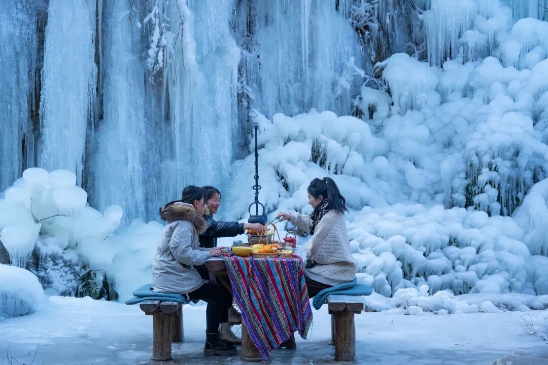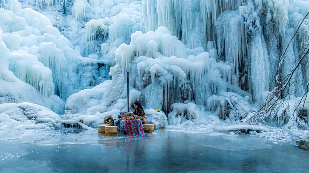 如同流苏般挂在山间的冰瀑,有着诗情画意的旖旎多姿,层层山涧被晶莹剔透的冰挂覆盖,让人宛若来到了冰雪世界。