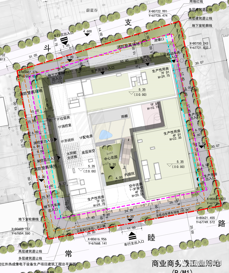 由浙江兆晟科技股份有限公司开发建设的余政工出【2022】1号地块年产1.803万套红外热成像电子设备生产项目,位于余杭区五常街道,荆长大道西侧,郭家斗支路南侧。项目用地性质为一类工业用地(M1),用地面积9445平方米。地块内新建一幢高层厂房,总建筑面积32023平方米,其中地上建筑面积23612平方米,地下建筑面积8411平方米;容积率2.5,建筑密度45%,绿地率20%;机动车停车位152个,非机动车位289个。本次公示仅为方案展示,后续施工图设计中允许在符合规划条件的前提下对局部进行适当调整。