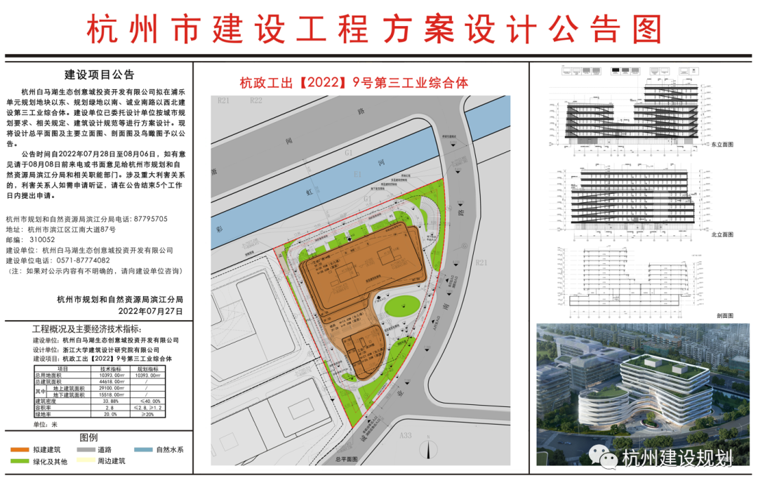 杭州白马湖生态创意城投资开发有限公司拟在浦乐单元规划地块以东、规划绿地以南、诚业南路以西北建设第三工业综合体。建设单位已委托设计单位按城市规划要求、相关规定、建筑设计规范等进行方案设计。现将设计总平面图及主要立面图、剖面图及鸟瞰图予以公告。