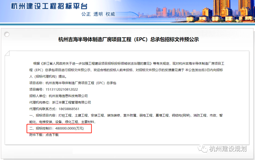 杭州吉海信息科技有限公司拟在临鸿东路以南,东至钱江直河、北至临鸿东路、南至江东六路、西至规划工业用地,建设杭州吉海半导体制造厂房项目,建设单位已委托设计单位按城市规