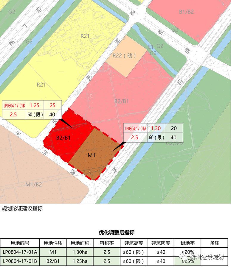 本次选址暨控规局部调整位于杭州市临平区星桥街道,东至相邻地块、南至华丰路、西至天华路、北至天元路。根据选址暨控规局部调整论证报告,拟设定:LP0804-17-01A地块用地性质为一类工业用地(M1),用地面积为1.30公顷,容积率≤2.5,建筑限高≤60米,建筑密度≤40%,绿地率≥20%;LP0804-17-01B地块用地性质为商务用地兼容商业用地(B2/B1),用地面积为1.25公顷,容积率≤2.5,建筑限高≤60米,建筑密度≤40%,绿地率≥25%。具体选址位置和模拟方案详见附图。