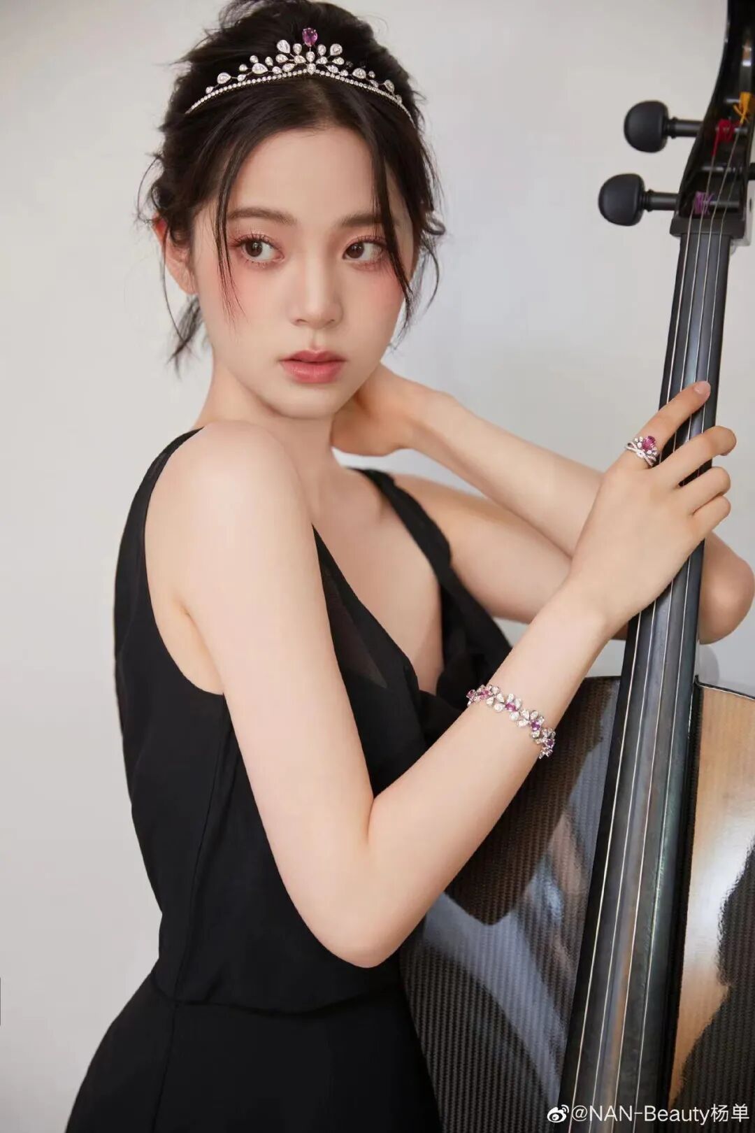 又或者这一款,抱着大提琴,头戴皇冠,妆容当然应该更加轻盈精致,呈现出才气千金感。
