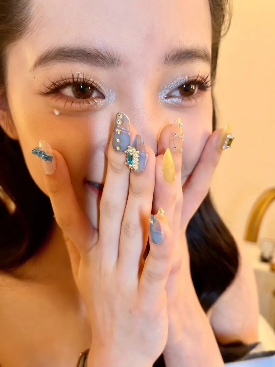 细闪亮片和眼线的走势都是要点,先看亮片。眼头位置用亮片顺着内眼睑向上扫,呈现出小美人鱼鱼尾的感觉,然后在眼头点缀上大颗亮片,缩短眼距,就靠它了。