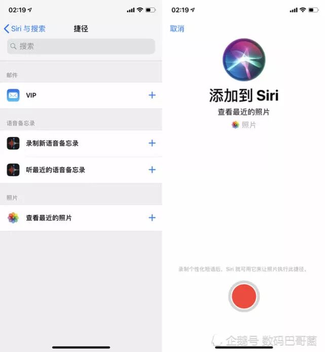 iOS 12中,siri新增了一项快捷方式功能。进入目录,发现只要邮件(VIP)、语音备忘录(录制新语音和听最近语音备忘)、照片(查看最近照片)四种操作,可以录制一个个性化短语来使用siri快捷启动该功能。