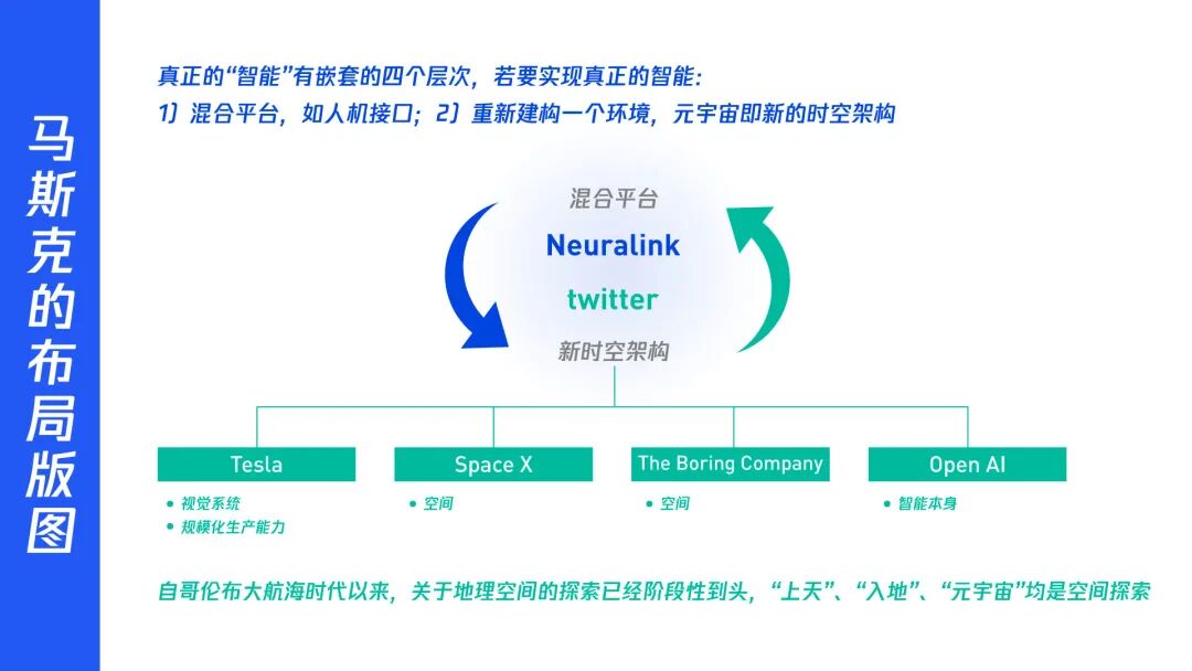 海外对AI的重视程度很高,真正的“智能”有嵌套的四个层次,若要实现真正的智能,需要满足1、混合平台,如人机接口;2、重新建构一个环境,元宇宙即新的时空架构。从这个角度,我们可以重新审视一下马斯克的商业布局版图(如下图)。