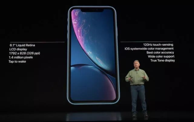 压轴登场的是iPhone XR,采用了7000铝机身边框、拥有6种颜色机身可选,机身防水级别为IP67。它采用了6.1英寸的“液晶视网膜”屏幕,目测下巴尺寸与iPhone XS差不多,不过分辨率要更低、为1792x828像素。