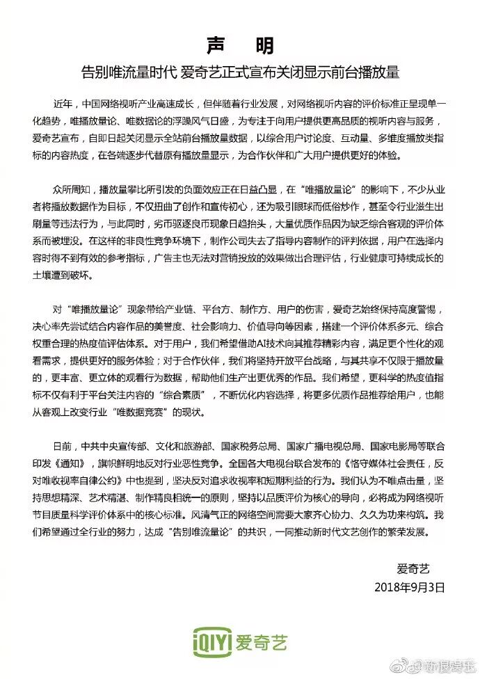一方面,视频网站的观念已经悄然发生了转变。9月3日,爱奇艺在官方微博发布声明称:告别唯流量时代,关闭显示前台播放量。对此,业内普遍叫好,认为该举措至少为肃清视频网站的数据环境树立了标杆,“因为视频网站也觉得假数据没有用,吸取前人教训,不能自取灭亡。”