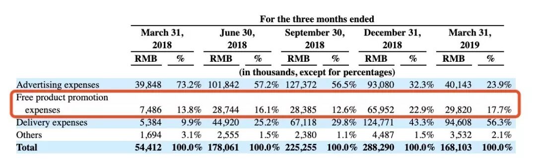 运营成本方面,2019年第一季度的运营成本为1.01亿元,相比上年同期的1381万元增长了755%。其中占据运营成本较大的项目为销售和推广费用、店面租赁和运营成本、原材料成本、管理费用。