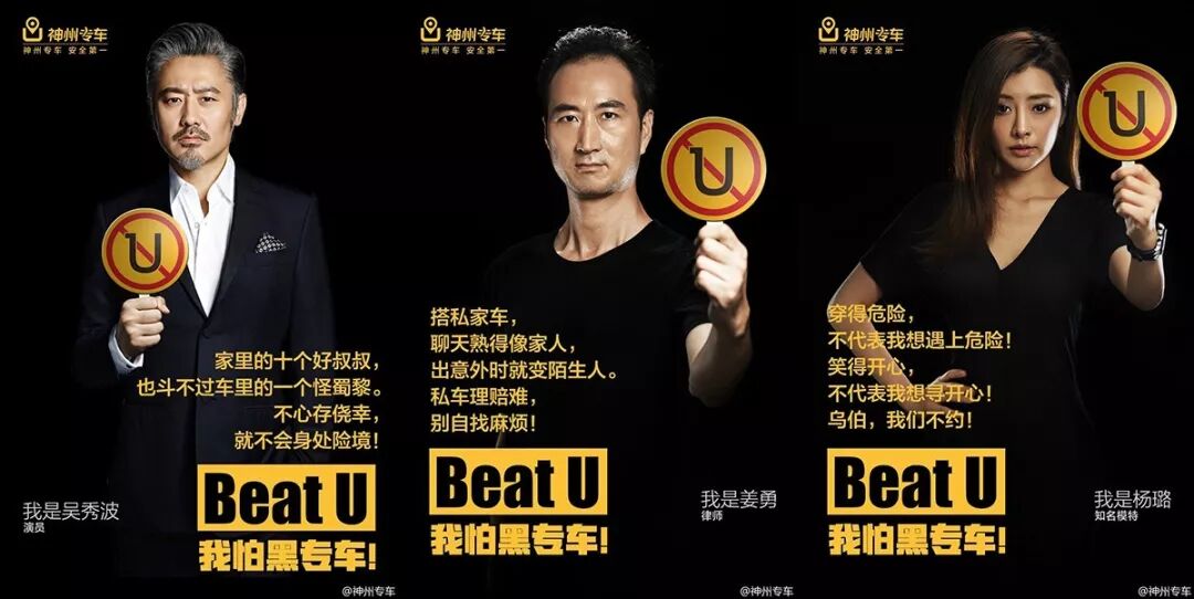 4年前,神州计划进入专车市场时,曾采取类似模式。2016年的中国专车市场,时滴滴与Uber双雄互相争霸的市场。神州专车于6月25日上午发布了由吴秀波、海青等当红公众人物打出一组“BeatU!”的海报。此处的“U”暗指Uber,海报内容直指黑专车的安全性,并推出了神州专车的“五星安全计划”。