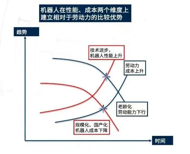 伴随着人口结构的变化,不断攀升的人力成本和机器人成本之间形成了十分明显的剪刀差。站在蓝驰创投的角度,我们认为,无论是服务行业还是工业物流,在未来30年,甚至是50年的大周期里,机器人将进入到一个蓬勃发展的阶段。