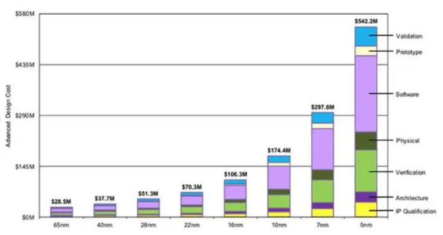 先进制程芯片的开发费用同样不遑多让,其研发费用主要包括芯片设计、IP、EDA、设备等,根据第三方半导体研究机构Semi engineering计算,28纳米制程的开发费用大约为5130万美元,到16纳米制程需要投入1亿美元,到5纳米制程节点,这个费用达到5.42亿美元。