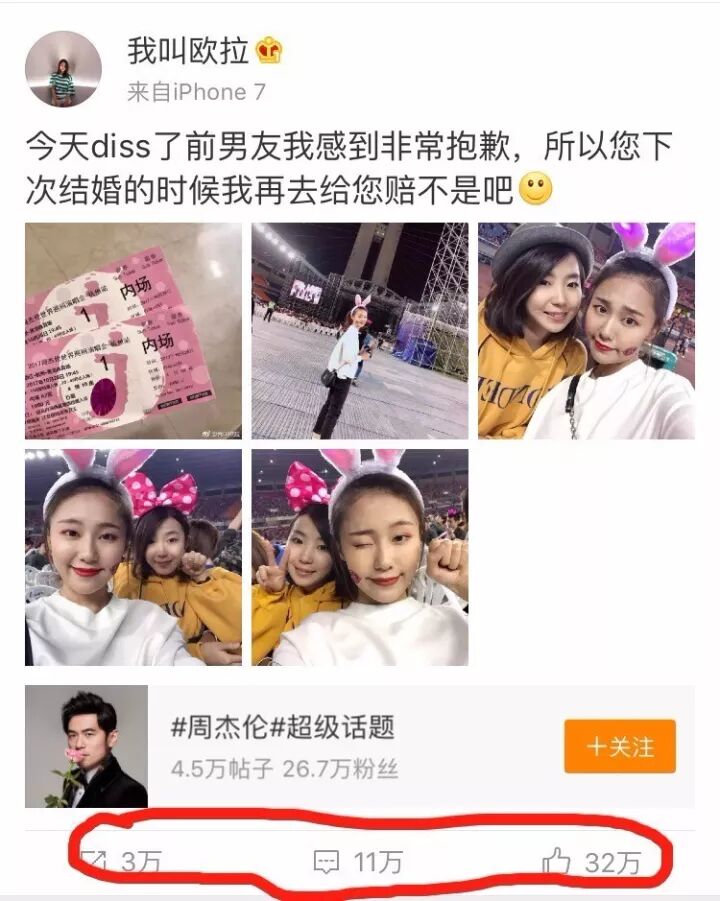 她自称是周杰伦的“粉丝”,买演唱会的内场票,叫周杰伦“老公”,却连周杰伦的相关微博都没有关注。演唱会前,只点赞过一条关于周杰伦演唱会上歌迷求婚的微博。