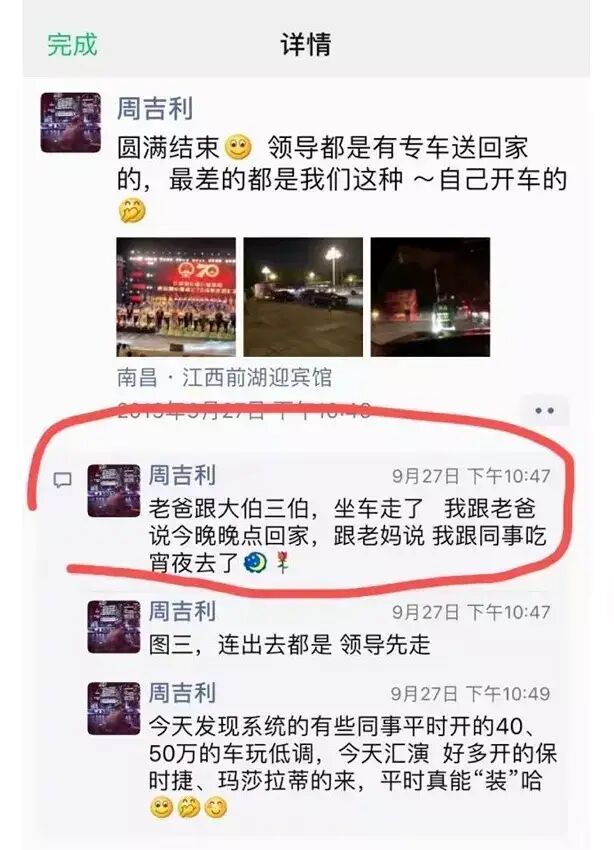 网传图片显示,周劼家族不少长辈应该都在当地交通系统工作,他自己就曾在公路局和高速工作过。2019年9月27日,周劼在朋友圈晒出自己在江西前湖迎宾馆观看一场演出,特意在评论区里写到“经济发展、交通先行—要想富,先修路”、“我大伯、三伯都来了,我爸也来了。”当地一官网发布的一篇文章显示,当晚当地的确组织了一场文艺汇演。从网传截图来看,周劼很感恩自己的家族有关系、有背景,并且互相照应。他提到,“父亲的副局长没问题了”“省厅人事处的人刚打了电话给我爸”,“感谢家族的所有人(三伯、大伯)”。如果说周劼是一个完全仰仗长辈的“官二代”,似乎并不准确。他曾专门发图文称自己跟单位一把手吃饭,又在评论区里透露,在父亲升迁的事情上,领导还帮他说了话,说“小周的父亲就是我的父亲,务必照顾。”周劼不无得意地说“儿子帮老子,严嵩 严世蕃”。对这一评价,很多网友都认为这充分暴露了周劼没有文化,严嵩严世蕃父子是著名奸臣,贪赃枉法,祸国殃民。周劼的朋友圈截图在网上引起热议后,有网友已经找出疑似周劼大伯、三伯的资料。大伯今年70岁,早已退休,曾任江西某高速集团相关负责人。三伯今年61岁,曾任某高速人力资源总监。另外,周劼的父亲曾任江西省某事业发展中心某处四级调研员。不过,这些情况并未得到官方证实。根据网传截图,周劼非常喜欢炫耀政府官员和国企高管与自己的交往,总是特意将这些人点名道姓地列出来。比如,他自称第一次跟着领导见一位当地领导,对方给他递了一根烟,为此他打破了已持续3个月的戒烟。还毫不掩饰地说“今天我好激动---比我妈给我买10套房还激动,开心。”好像是生怕别人不相信,周劼特意把这位领导的百度资料截图也发在了朋友圈里,还在评论区里告诉大家,烟1200元一条,还买不到。![]()