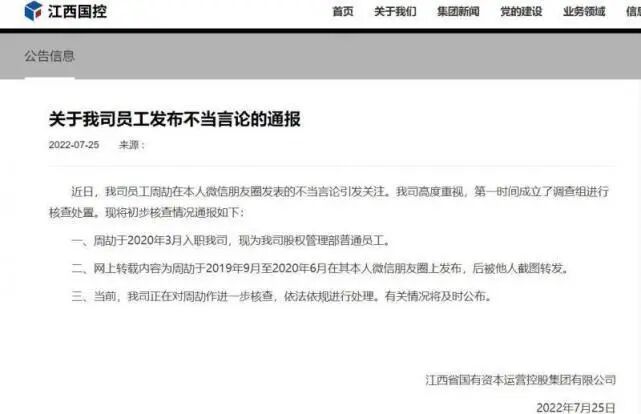 7月25日晚间,江西省国有资本运营控股集团有限公司官网发布了情况通报,确认了“周劼”的身份。通报称,近日,该公司员工周劼在本人微信朋友圈发表的不当言论引发关注。该公司高度重视,第一时间成立了由纪委牵头的调查组进行核查处置。根据江西国控初步核查情况的通报:周劼于2020年3月入职该公司,现为股权管理部普通员工;网上转载内容为周劼于2019年9月至2020年6月在其本人微信朋友圈上发布,后被他人截图转发;当前,该公司正在对周劼作进一步核查,依法依规进行处理。有关情况将及时公布。企查查信息显示,江西省国有资本运营控股集团有限公司注册资本60亿,江西省国资委是最大股东,持有江西国控集团90%的股份;江西省行政事业资产集团有限公司持股10%。总结周劼朋友圈截图内容归纳有三点,一是炫父,周劼宣称,“父亲的副局长没问题了”“省厅人事处的人刚打了电话给我爸”;二是炫富,喝的白毫银针20万一斤,戴欧米茄手表、系LV皮带;三是炫背景,多次发表“和单位的一把手吃饭”“我办公室主任怕我吹空调冷,帮我加挡风板”等言论。见过“凡尔赛”的,还真没见过如此“凡尔赛”的。这种愚蠢而又带有挑衅意味的行为,使得南昌周劼一下子成为“网络顶流”,连带着他所供职的单位也被聚焦,让他的“权力家族”进入公共视野。周劼的“凡尔赛”都制造了社会矛盾,让很多人产生不公平感和被剥夺感。周劼都必须为自己的言行负责并承担相应责任。接下来周劼会凉凉吗?我们拭目以待。只有一查到底,才能依法维护社会公平正义。对于此事,你怎么看?