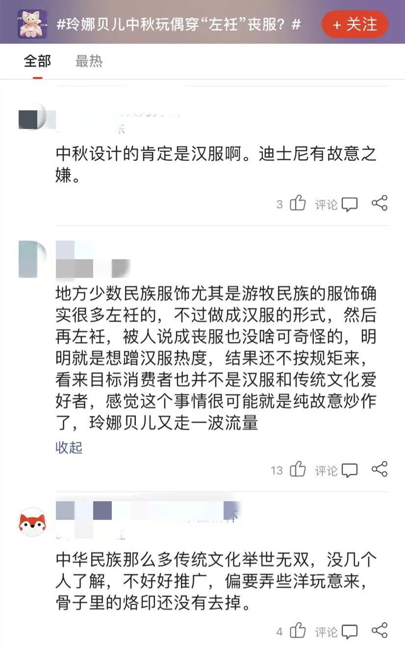 近日,上海迪士尼乐园推出了玲娜贝儿中秋限定款毛绒玩具。其官方旗舰店的商品图显示,毛绒玩具身着“荷花刺绣服饰”,前襟向左掩,系“左衽”设计,引发争议。有网友认为,依照汉族传统,死者才用“左衽”,意指玲娜贝儿穿的是“丧服”。