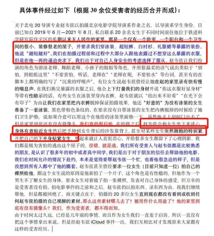不仅拍摄大胆,爆料者称赵韦弦还曾对参与拍摄的女生进行骚扰行为,他会在和女生单独相处时,突然抱住对方,下半身紧贴对方,吓得参与拍摄的女生直接逃离现场。