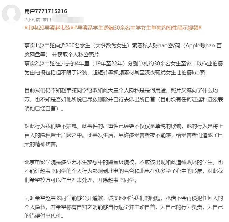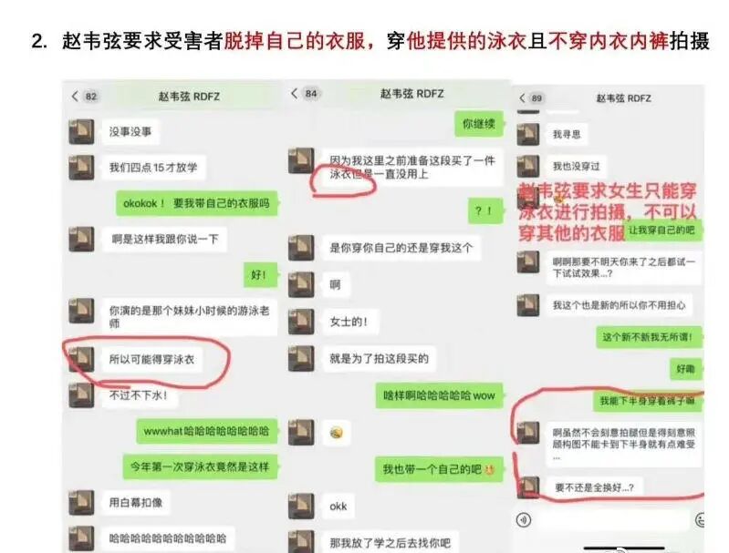 赵韦弦甚至还曾对女生提出过拍摄完全不穿衣服照片的要求,但这位女生拒绝了他的要求。不过具体赵韦弦有没有找过其他人拍摄类似照片,目前无从得知。