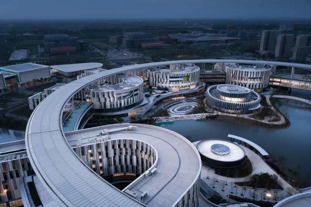 与传统的核心式、线性式、分叉式结构相比,这种超大尺度的环状结构可以串联起不同的功能空间,形成综合而扁平化的组合,实现「融合共生」的设计理念。