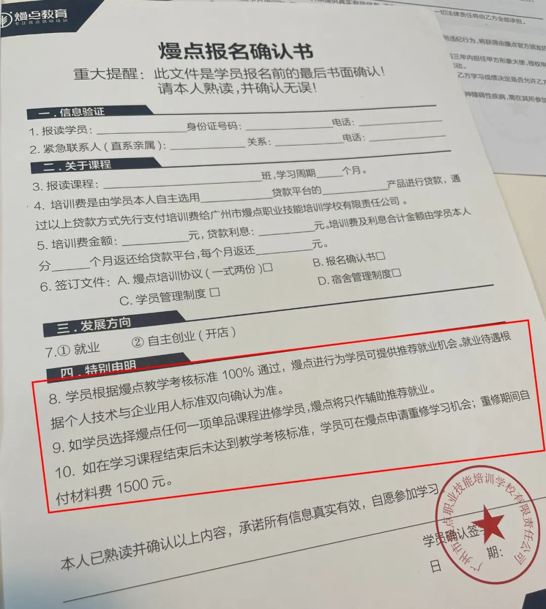 另一份“熳点报名确认书”上,特别申明处写着:学员根据熳点教学考核标准100%通过,熳点为学员提供推荐就业机会。就业待遇根据个人技术与企业用人标准双向确认为准。如学员选择