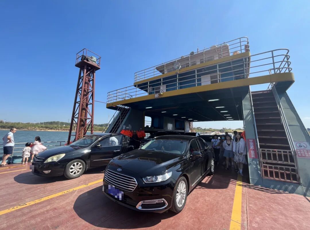 稍作等待后,华美和小朱坐上了登陆“海岛”的船只——兴马洲号。她们对于“汽车登船”这件事感到十分新奇。船只在航行中,不少游客从车上下来,来到甲板上一睹江景。江风里混着些腥气,使人感到莫名的清醒和放松。