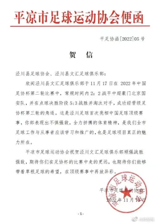 11月18日,平凉市体育局和平凉市体育总会给泾川文汇足球俱乐部发来了贺电。