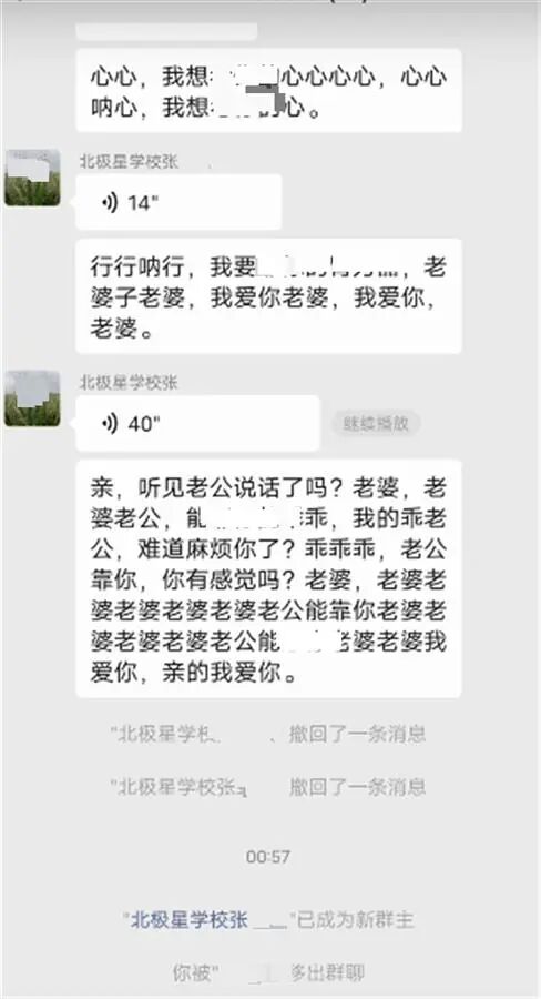 11月24日流传到网上的一段录屏视频显示,凌晨时分,群名称为“北极星学校张某某”的男子,在“北极星幼儿园中班”群里发送了多段语音,男子声音颤抖,不停地说“老婆……”。