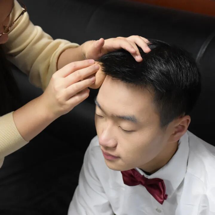 上午10时,同学们便集中在一起,井然有序地开始化妆,进行最后的准备。男生们一身西装,沉稳大气,又带着一抹俊俏;女生们长裙席地,优雅端庄,又别具一番温婉。我院张世闯、杨赛老师也作为教师代表,加入到合唱的队伍当中,给同学们加油打气。
