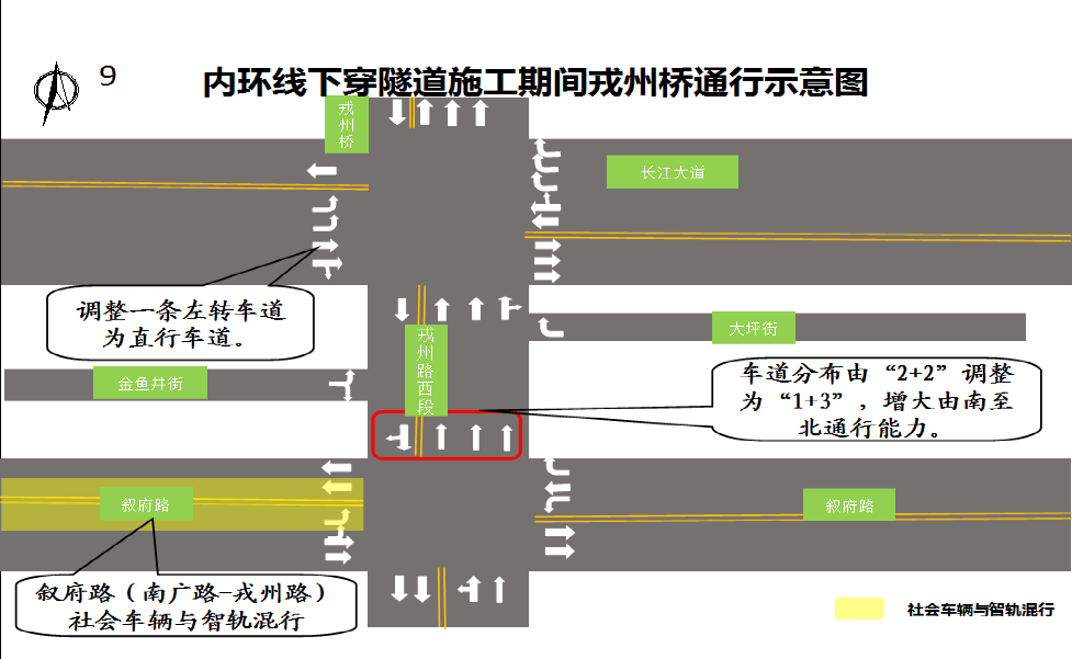对柑子园街至黑塔路段和广场东路至民康路段实施交通管制,封闭主车道仅保留现有辅道供车辆通行;其中龙湾路口、叙府路口、商贸路口、航天路口做半幅封闭管制,保留双向4至6车道通行空间(含智轨车辆)供车辆通行。(一)禁止一切车辆驶入管制路段辅道通行(公交车、电动车、摩托车,消防车、救护车等特种车辆除外);管制路段两侧小区、单位机动车、非机动车,在确保安全的情况下可借用人行道进出小区。(二)禁止社会车辆从与蜀南大道相交的道路(龙湾路、黑塔路、金芽菜街、安居南街、广场东路等)进入蜀南大道辅道(含进出口设在蜀南大道上的小区、单位及商家等)。其中叙府路、商贸路、航天路车辆可直行经过路口,禁止左右转进入蜀南大道。(三)酒都路前往广场西路车辆,可在党校门口掉头后经蜀南大道右转进入广场西路;该路口原有通行规则不变。对路源街至文化路段实施交通管制,封闭部分车行道,保留长江大道两侧1至2条车道双向通行(南门大桥右转至文化路一侧和蜀南大道右转至长江大道一侧保留2车道,其余方向保留1车道),长江大道蜀南大道交叉口保留半幅路口范围供车辆通行。(一)经南门大桥前往南岸片区车辆可右转进入长江大道西段、文化路和三江路方向;也可直行至柑子园街路口掉头区,掉头进入蜀南大道后右转进入长江大道,前往戎州大桥方向。(二)禁止车辆从长江大道西段左转进入文化路,可经蜀南大道柑子园街路口掉头前往长江大道行驶;禁止车辆从文化路左转进入长江大道西段,可在川红路口掉头行驶;禁止长江大道车辆左转进入路源街,可在六中掉头处掉头行驶。南广路至戎州路段,允许社会车辆进入智轨车道通行,禁止社会车辆在蜀南大道叙府路路口转向,仅可直行经过路口(公交车、非机动车、摩托车,消防车、救护车等特种车辆除外)。