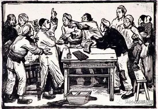 中国新兴木刻版画运动是由鲁迅1931年在上海倡导发起的,此为作品之一《减租会》,古元