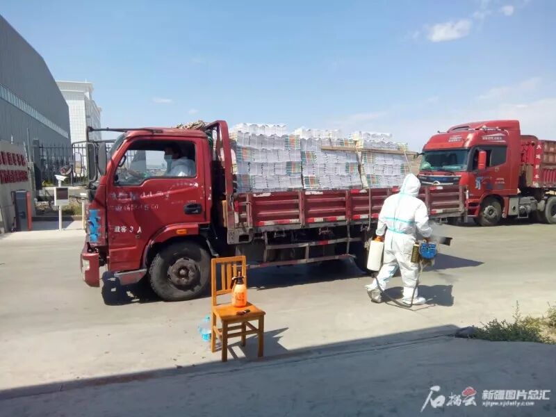 新疆新华书店发行有限责任公司工作人员对运送书籍的车辆等进行消杀。王兵 摄