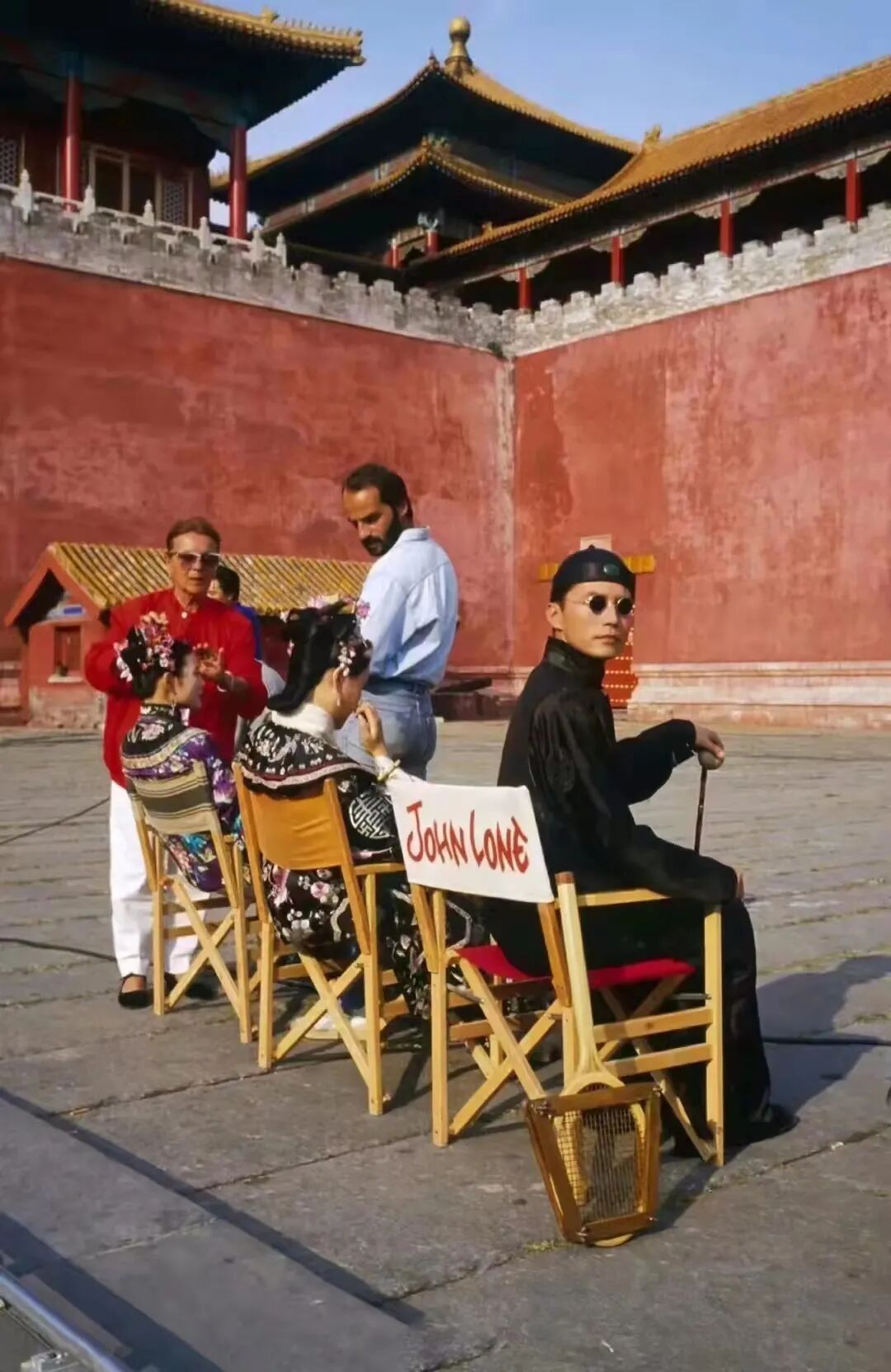 《末代皇帝》拍摄现场,坐在左一的是陈冲,右一是尊龙