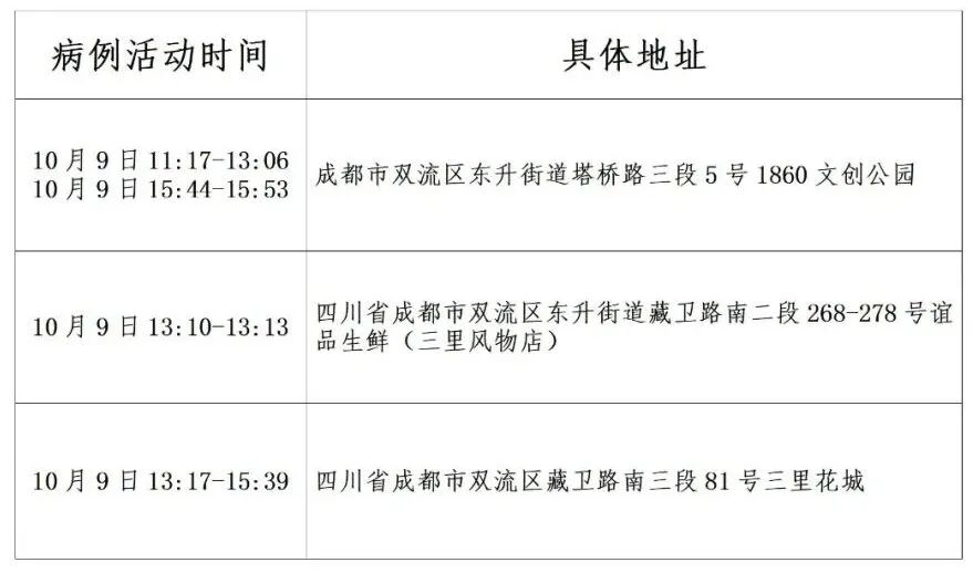 因疫情防控排查需要,为了您和他人的健康,请广大市民朋友对照查看,如与以下活动轨迹有重叠的市民立即向社区和单位(或居住的酒店)报备,三天内接受三次核酸检测(间隔24小时),在三次核酸结果未报阴性前,严格居家,除两点一线核酸外,不外出、不聚集。感谢您的配合!