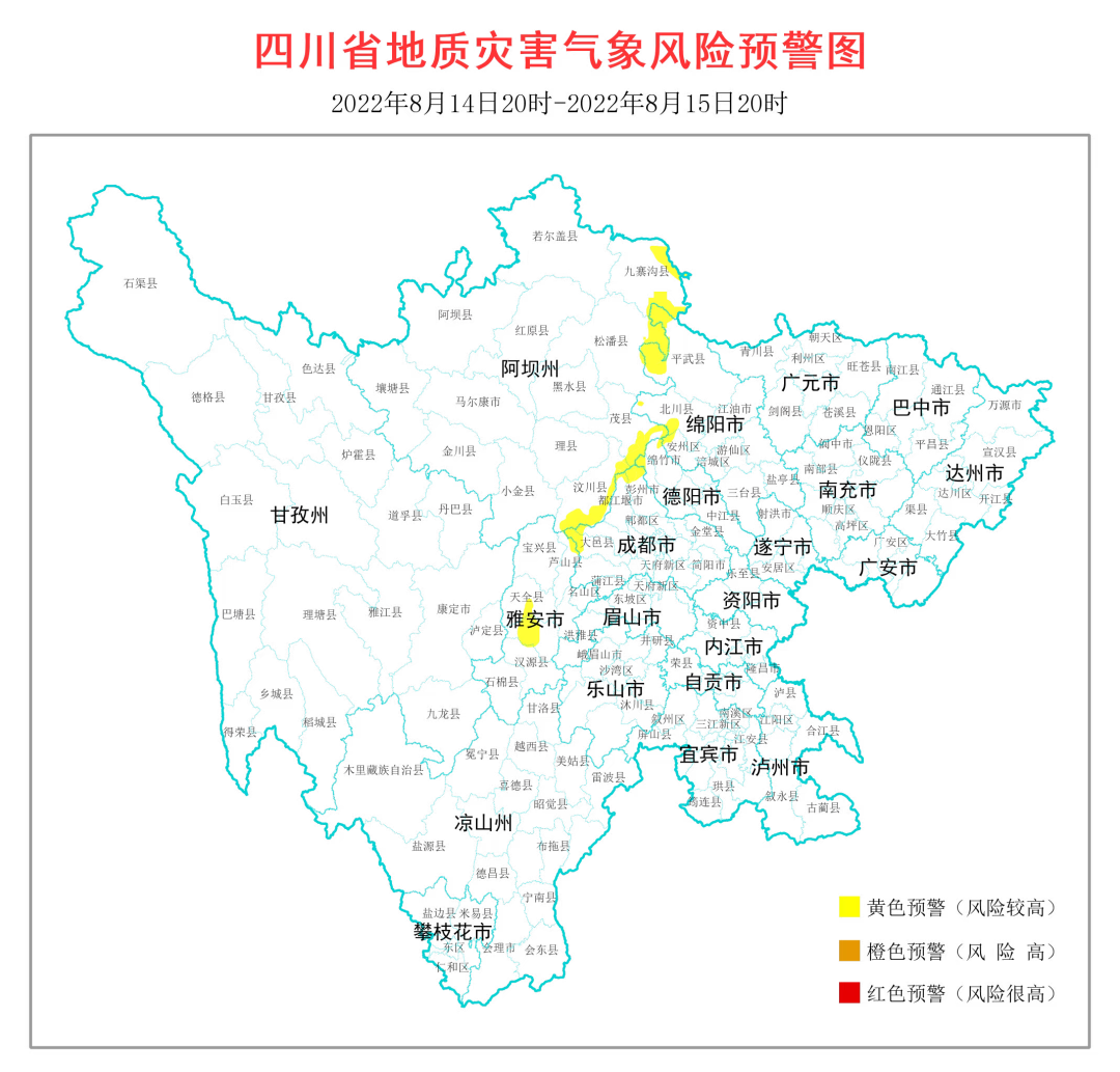 2022年8月14日20时至15日20时,九寨沟、松潘、 汶川、平武、北川、什邡、都江堰、崇州、大邑等县(市) 可能发生山洪灾害。